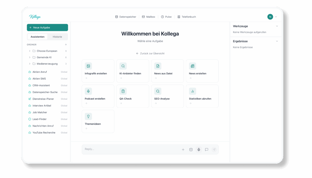 Kollega ist mehr als eine App, ein Plugin und ein Chatbot. Statt nur Antworten zu liefern, übernimmt Kollega eigenständig fachliche Aufgaben und steuert komplette Prozesse.