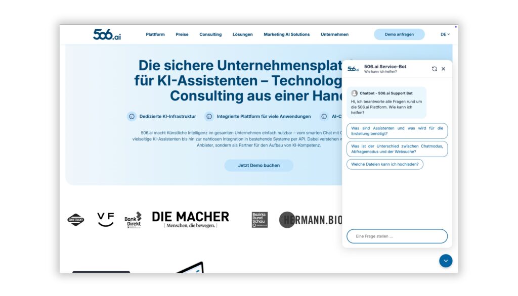 Ab sofort können 506.ai Enterprise Kund:innen direkt in CompanyGPT Chatbots erstellen, die auf spezifisches Unternehmenswissen zugreifen – ganz ohne zusätzliche Tools oder komplexe IT-Projekte. Diese intelligenten Helfer arbeiten rund um die Uhr, entlasten Ihre Teams nachhaltig und informieren Mitarbeitende, Kund:innen und Lieferant:innen zu allen Themen.