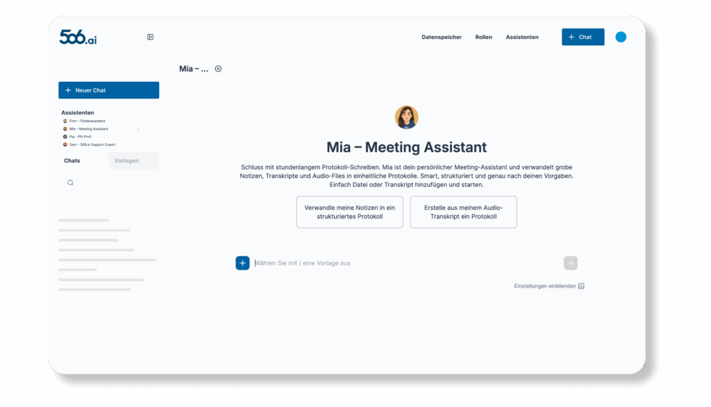 Zum Start erhalten Sie vorkonfigurierte Starter-Assistenten, darunter Mia (Meeting-Assistent), Finn (Förderassistent), Pia (PR-Assistent) und Sam (Plattform-Assistent). Diese werden auf Ihre Gemeinde angepasst und können danach erweitert werden.